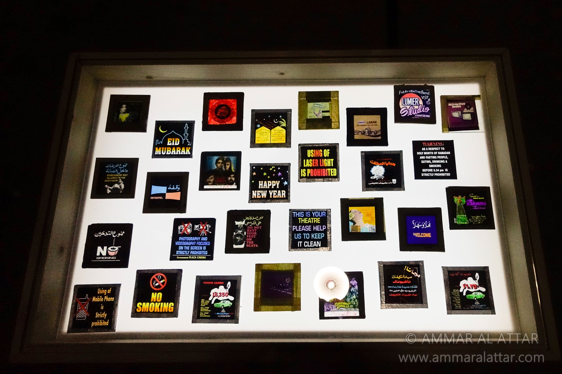Starting from the final screening two years ago, till its demolition late last year, Al Attar visited the site dozens of times, gaining the trust of people who worked there and whose job it now was to shut the place down. He systematically photographed and collected artifacts that sparked his interest, from old paper tickets and communiqués with distributors, to old film reels and hand-painted glass slides that were used to promote nearby businesses and set the house rules before screenings. In this exhibition, Al Attar presents a selection of what he found, alongside images that he took, reworked and reframed to narrate his encounter.